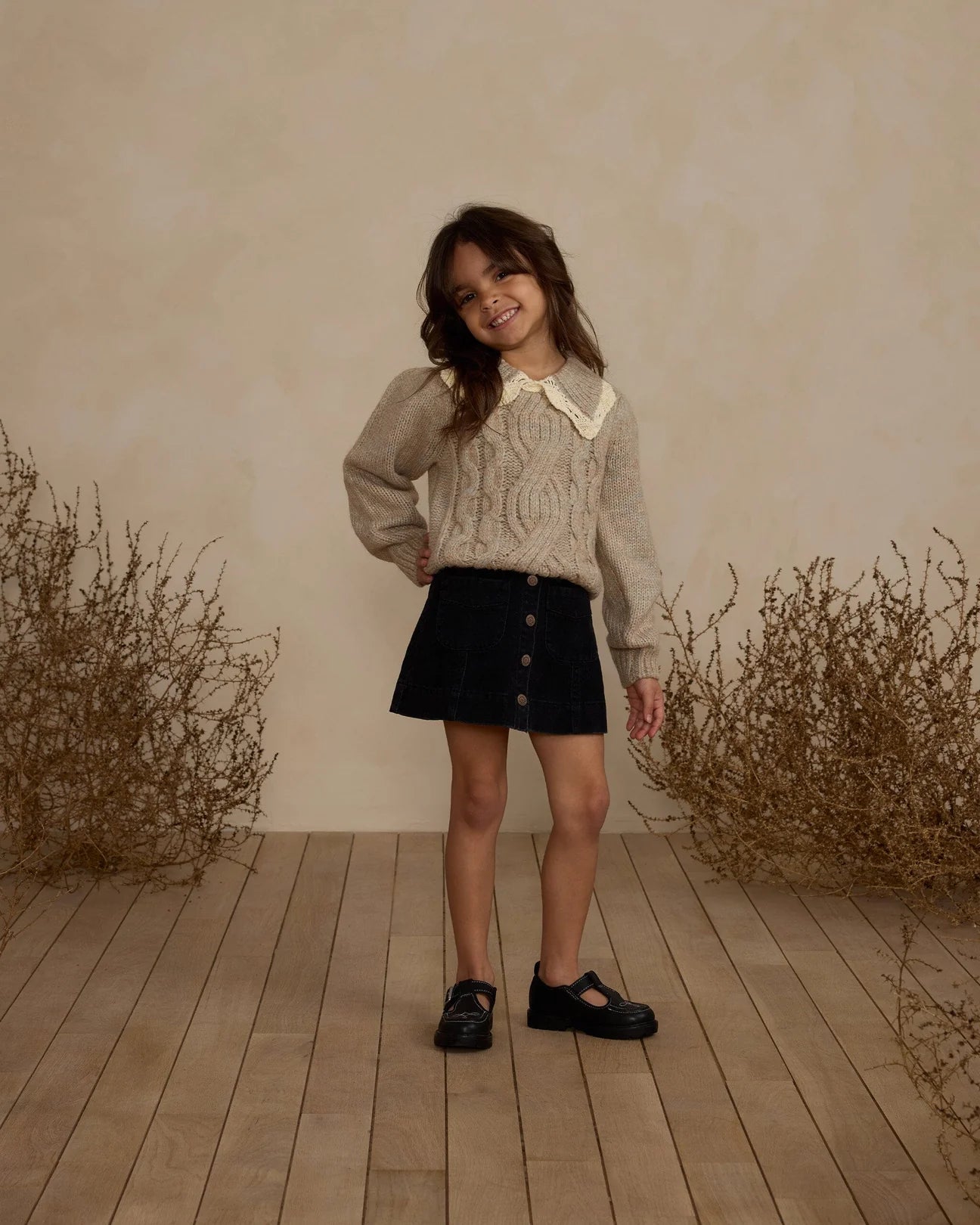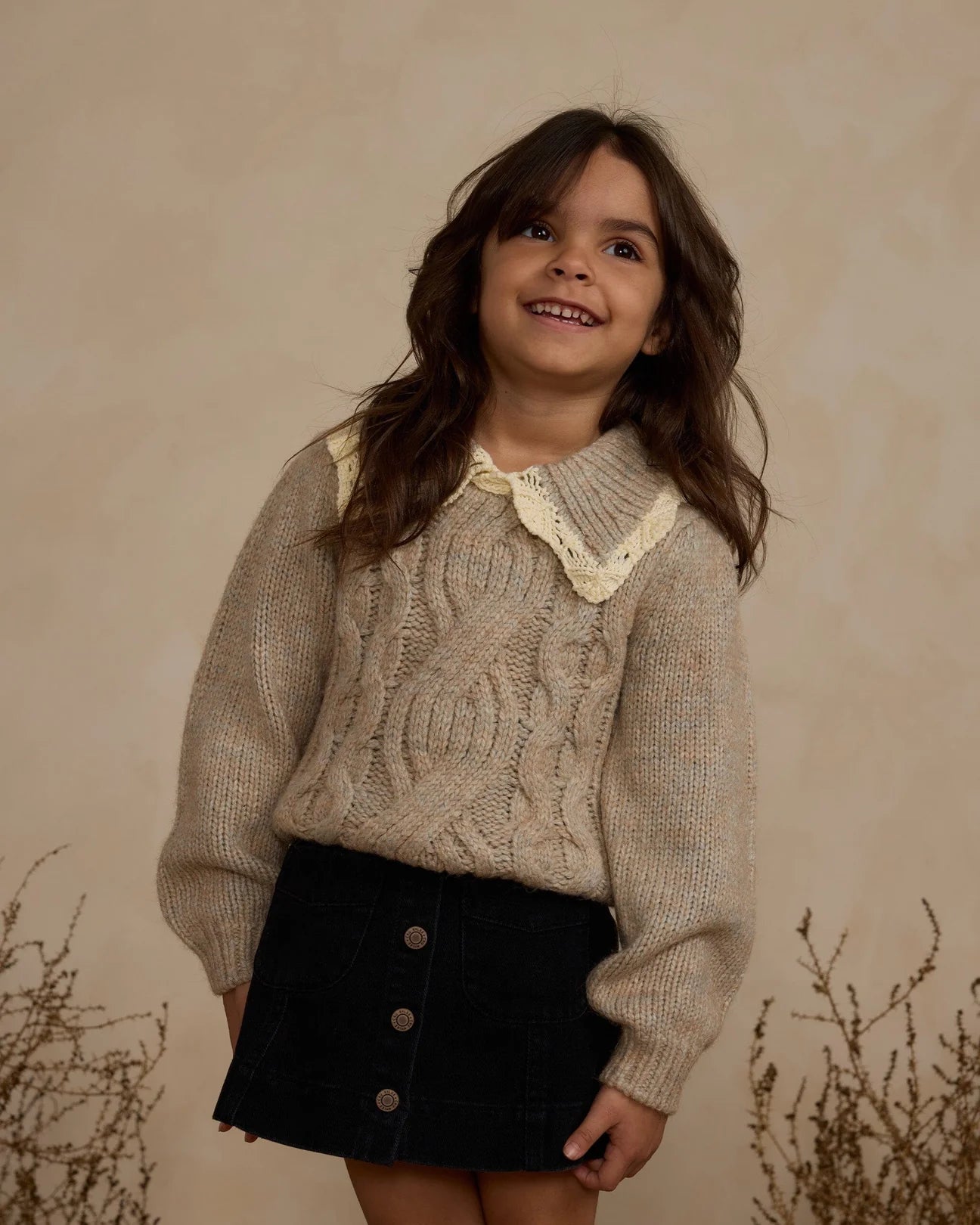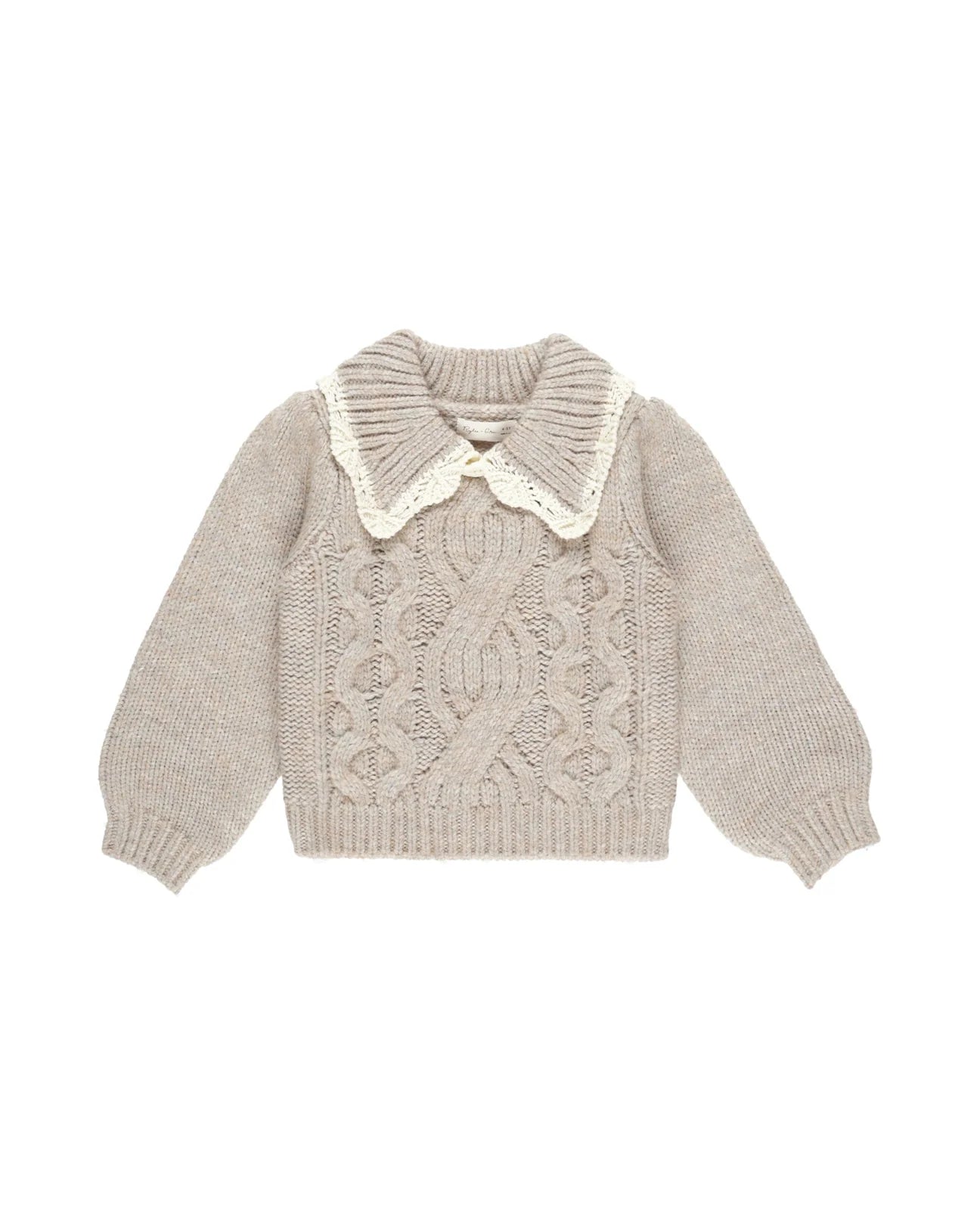 Our Alice Sweater is a cozy sweater featuring a detailed rib and crochet collar. With a cable knit front design and gathered puff sleeves.
