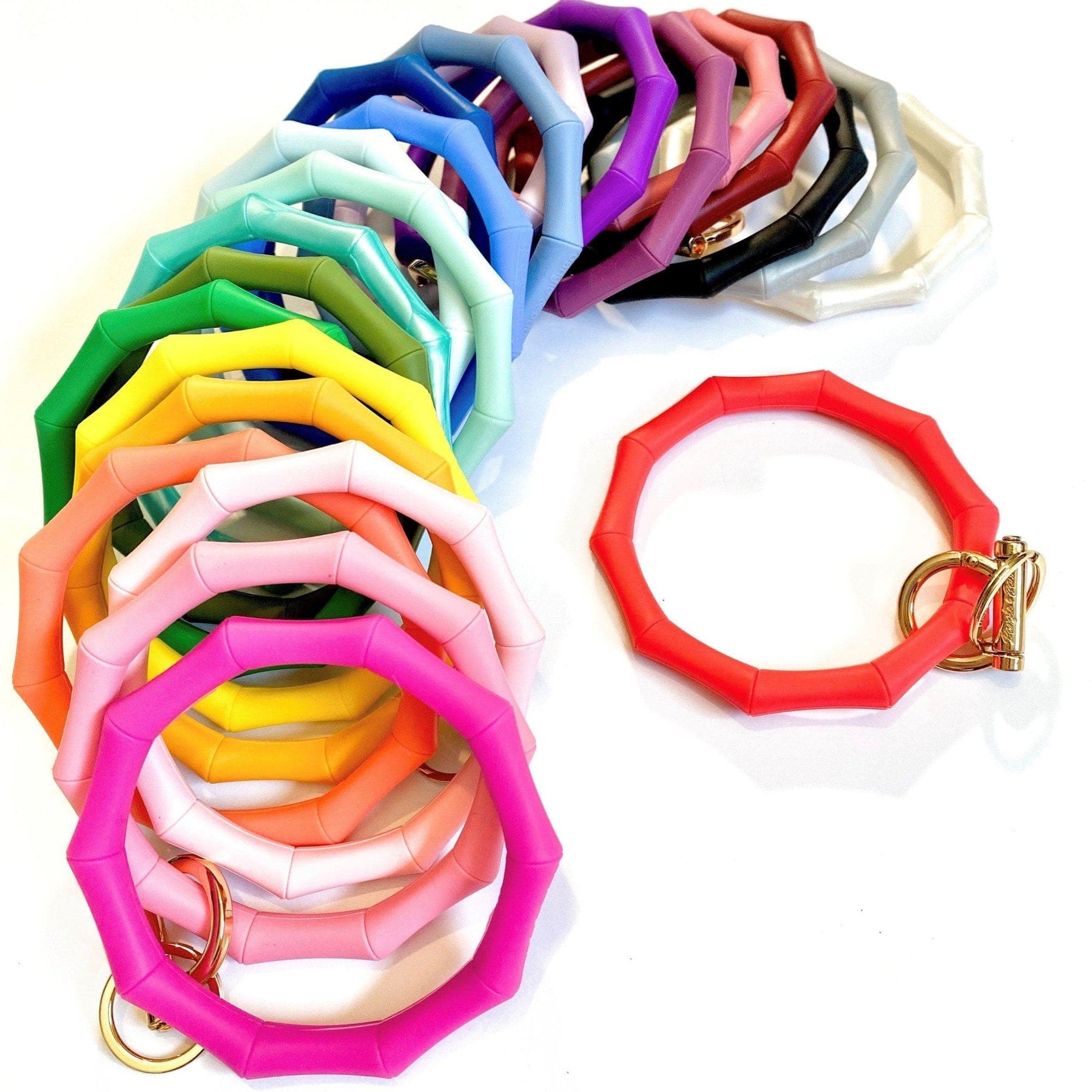 Our bracelet key ring is all grown up! This elegant and modern take on the classic bamboo bangle is the perfect accessory. Beautifully designed, and in a range of vibrant color choices, the Bamboo Inspired Bracelet Key Ring elevates the everyday.