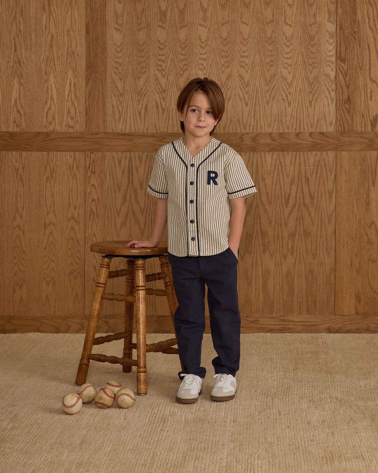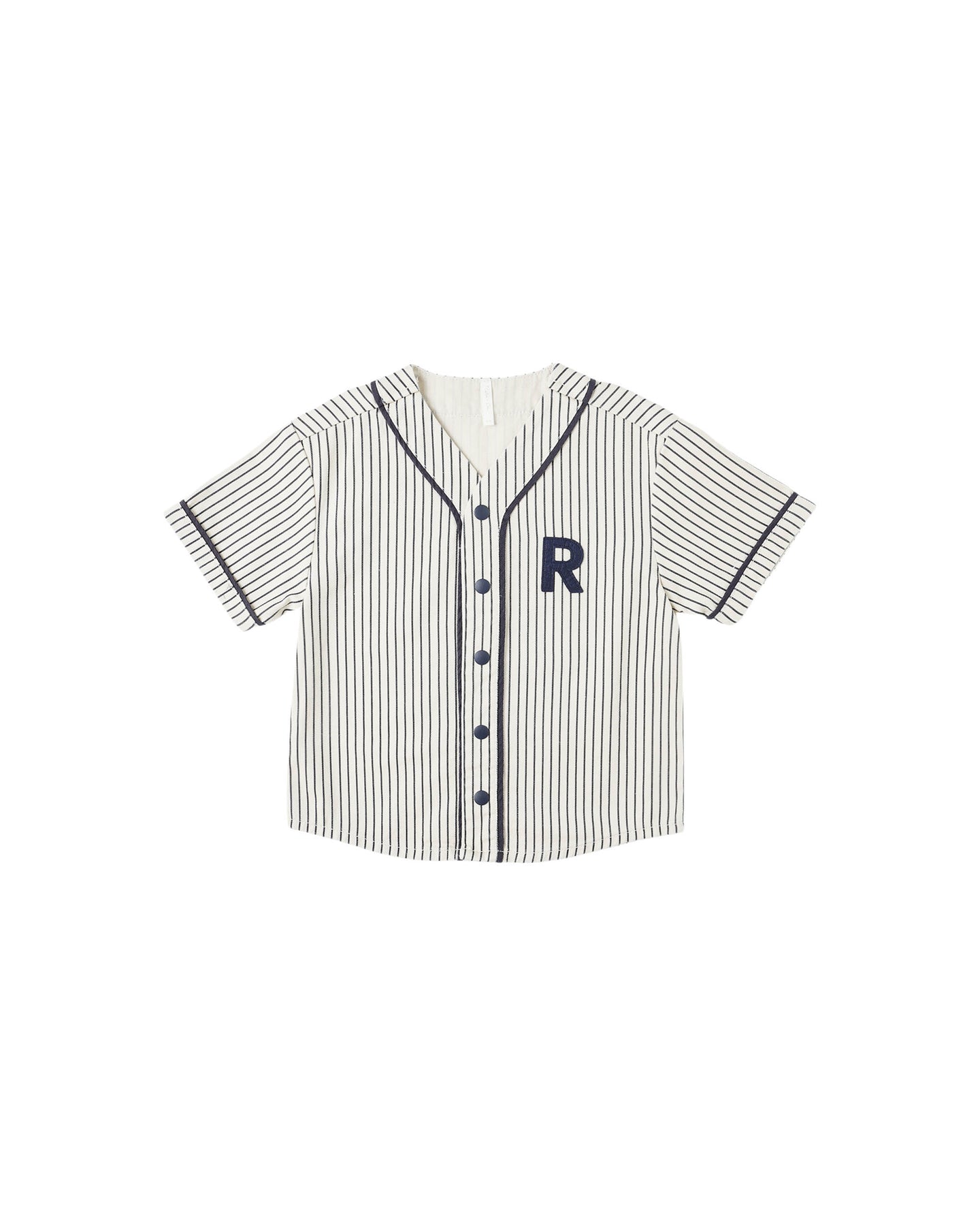 Classic full-button baseball tee with a relaxed fit and curved hem.