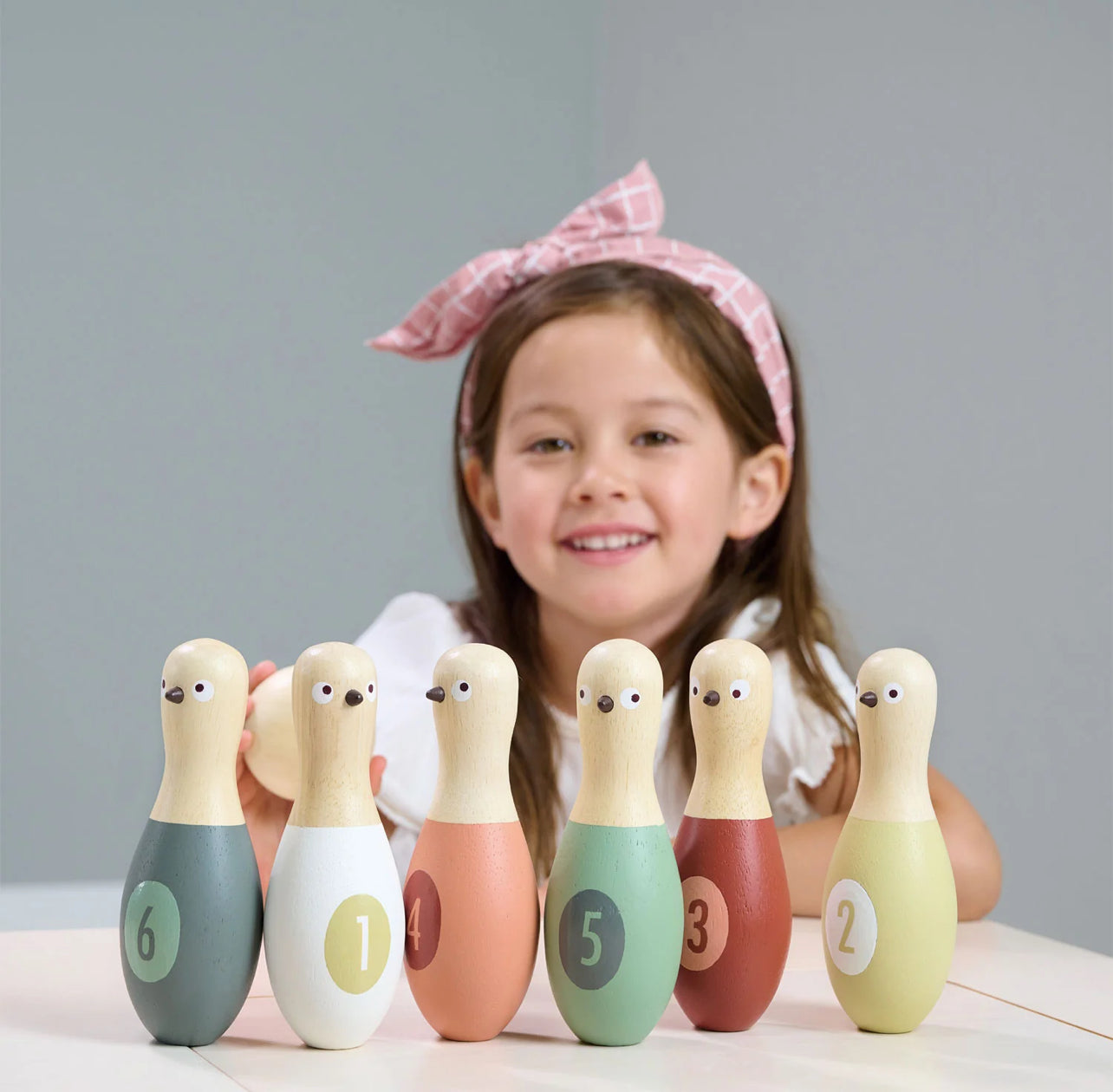 6 skittles inspired by friendly pigeons and a solid wood ball. Different colors and numbers for competitive games. Includes a printed drawstring bag.