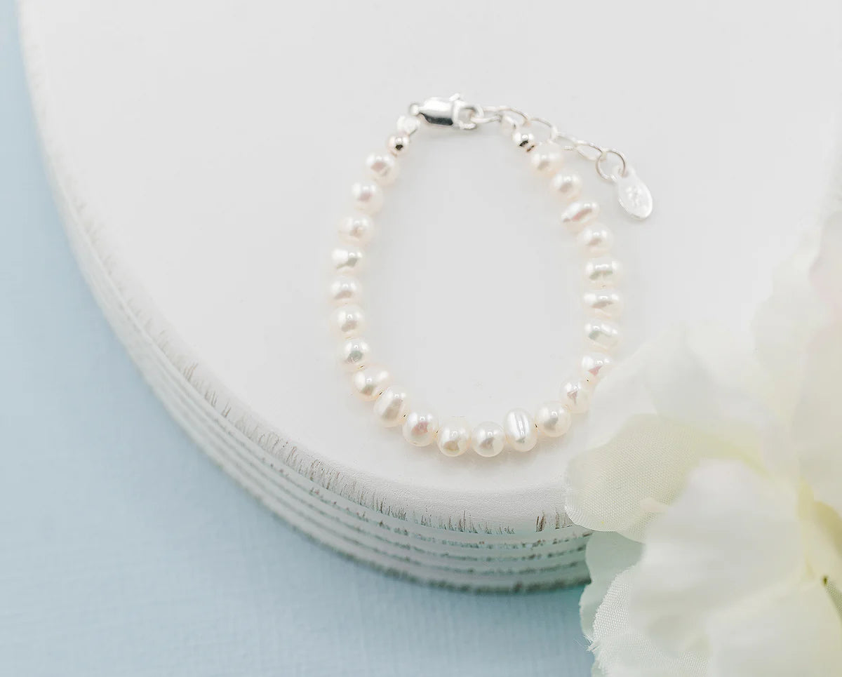 Beautiful keepsake sterling silver bracelet with strand of genuine soft white freshwater pearls - a gorgeous classic. Your child's first pearls! Each bracelet has an extension chain, as the child grows you just move to the next link for a perfect fit. This bracelet is available in three sizes and is great for infants, babies, toddlers, and kids. This jewelry comes in a beautiful gift box and is hand made in the USA! Celebrate these cherished moments with this keepsake she will treasure forever.