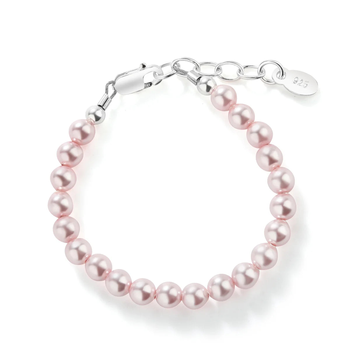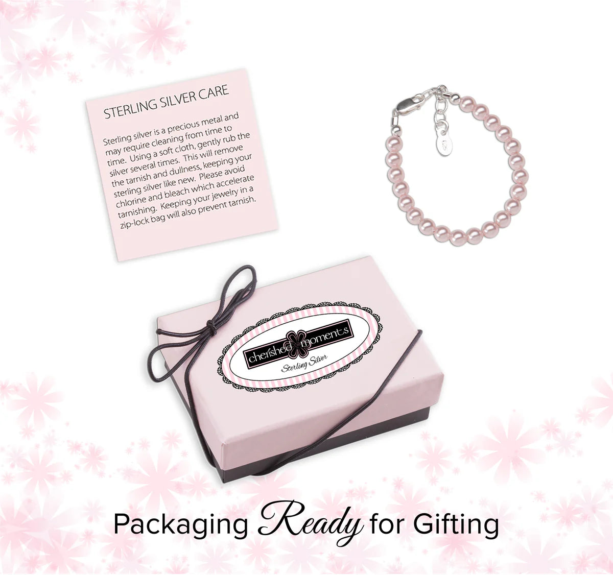 Beautiful sterling silver bracelet featuring a strand of light pink high-end simulated pearls - simple and classic! This looks beautiful for flower girls or Jr. Bridesmaid and is a timeless keepsake that makes a perfect baby gift, flower girl gift, or her first pearls! Each bracelet has an extension chain, so as the child grows you just move to the next link for a perfect fit. This bracelet is available in three sizes and is great for infants, babies, toddlers, and kids. This jewelry comes in a beautiful gift box and is hand made in the USA! Celebrate these cherished moments with this keepsake she will treasure forever.