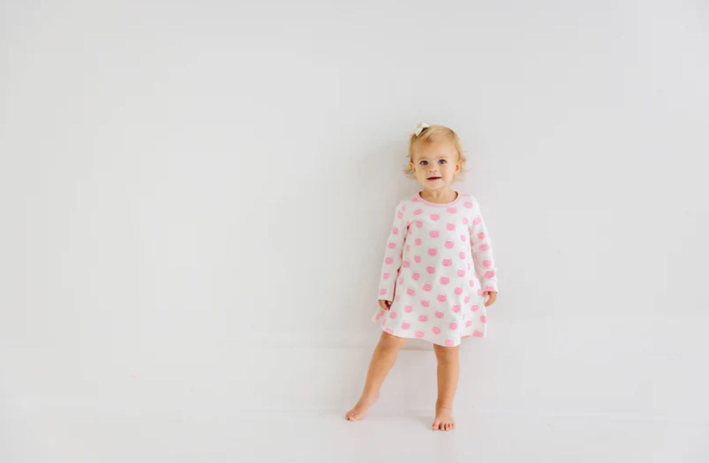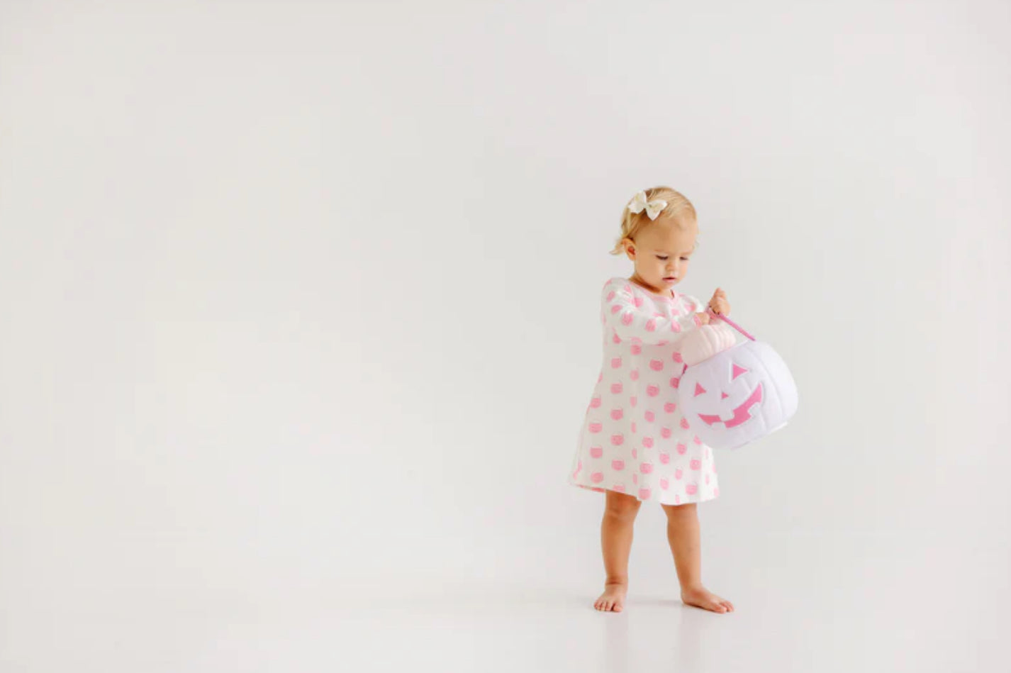 Our Long Sleeve Polly Play Dress is a must have for your little lady! Featuring Vintage Prep Pumpkin Pails with Sandpearl Pink, this play dress is perfect for any plans she may have!
