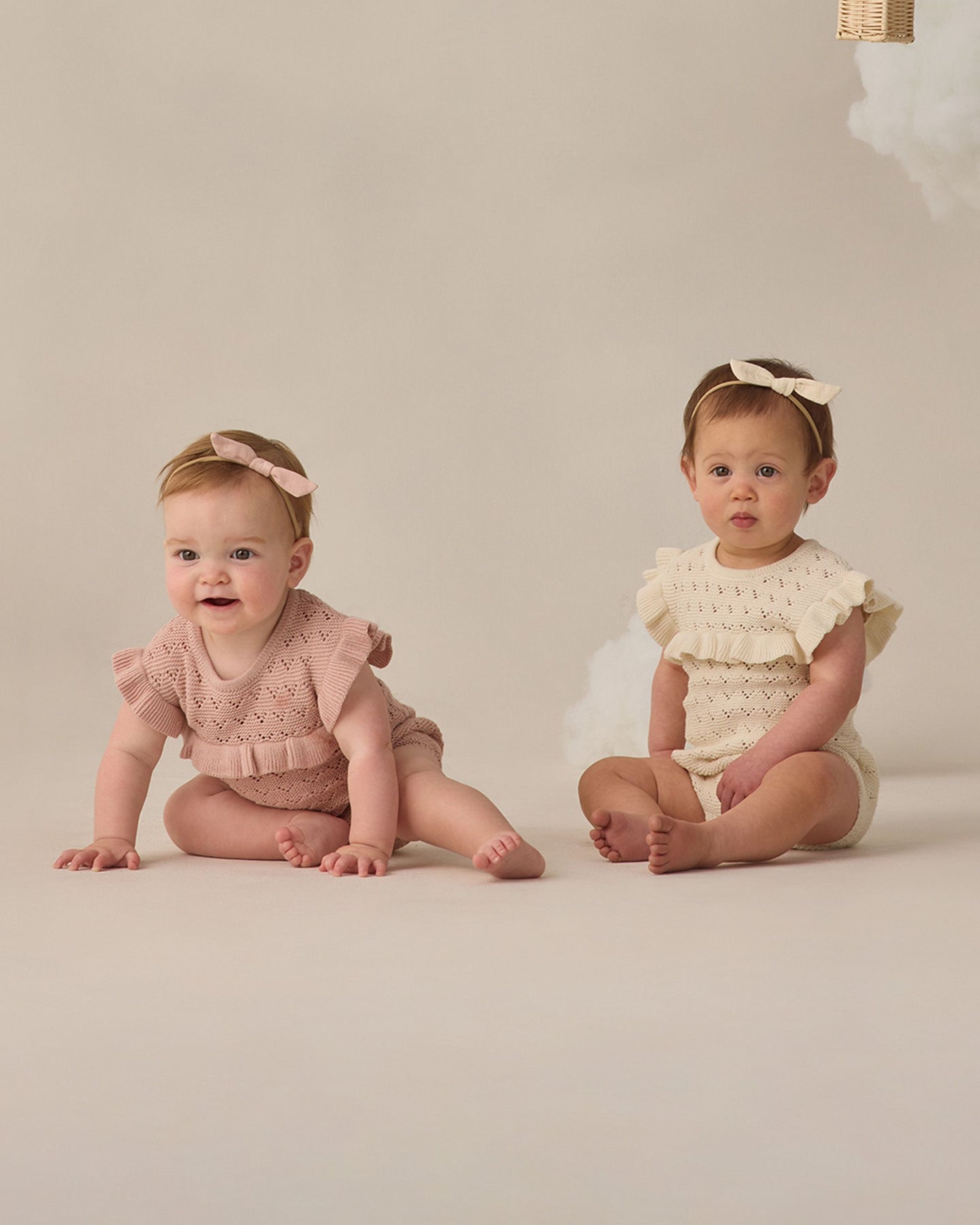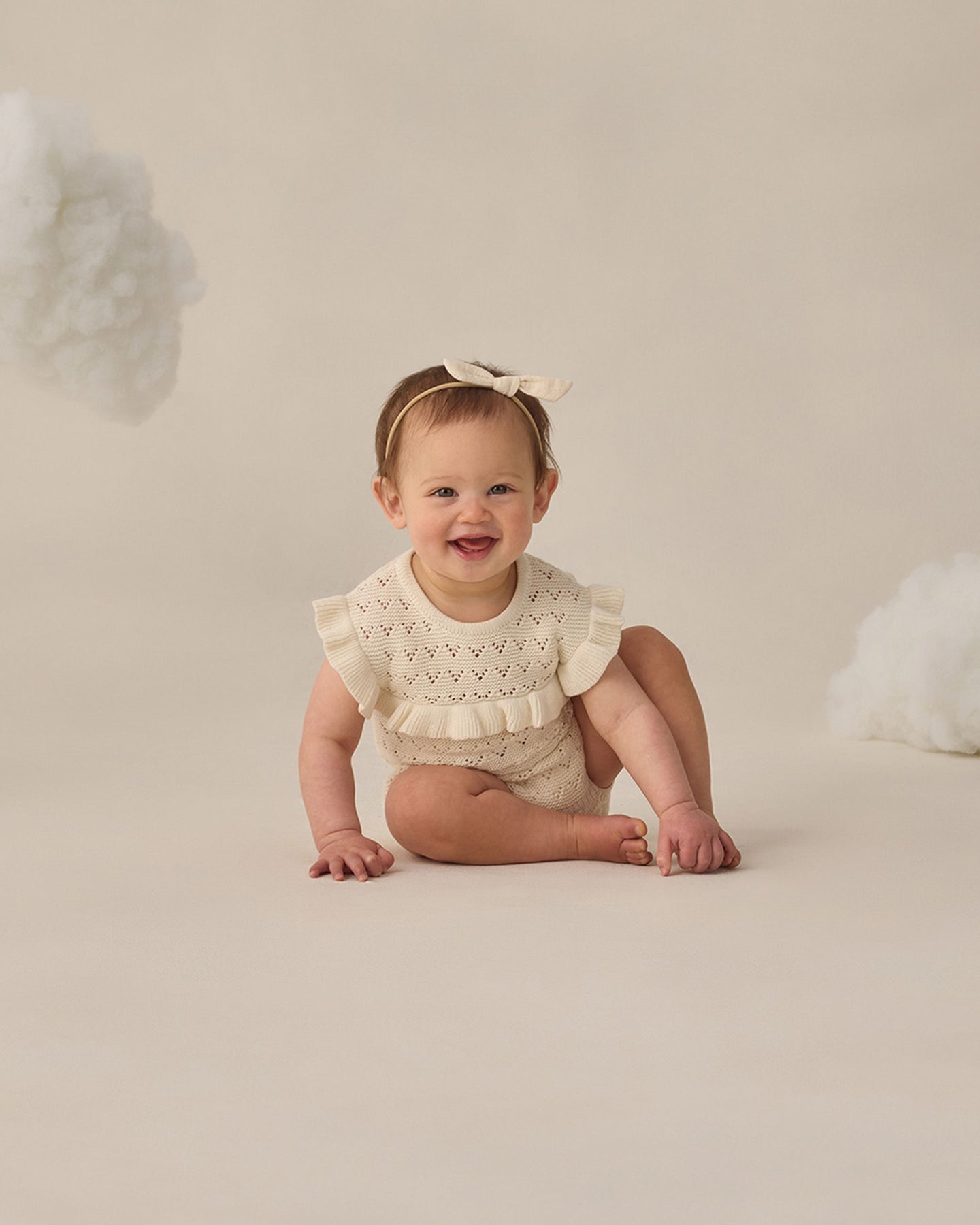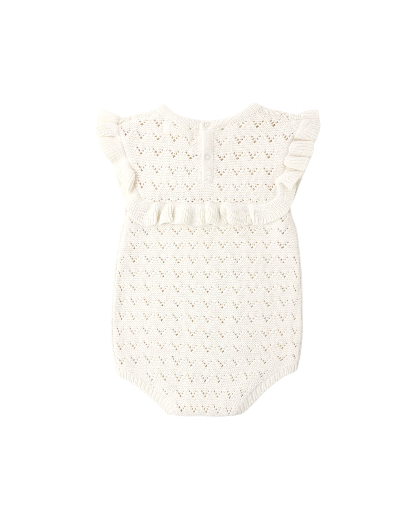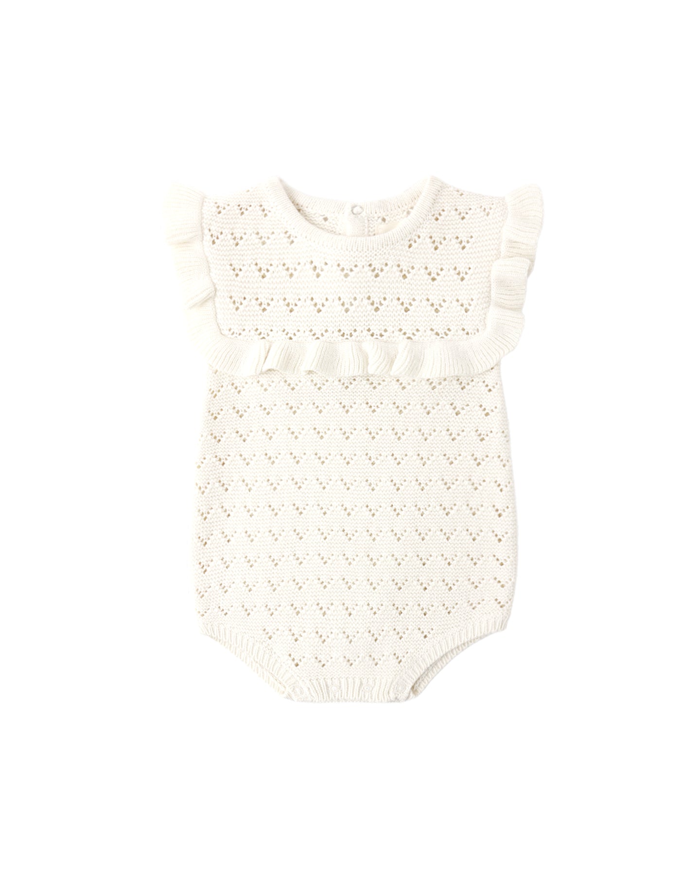 This pointelle romper has all the knit details and vintage feels. With an adorable ruffle trim, this romper looks cute for any special occasion.