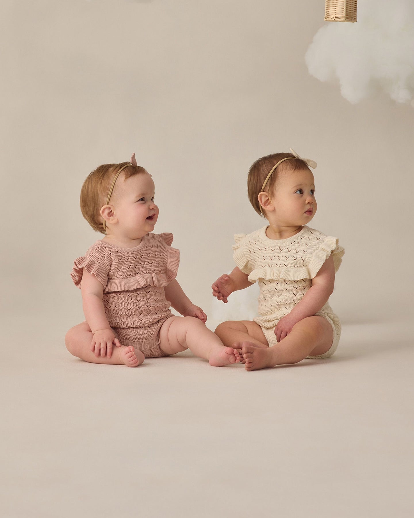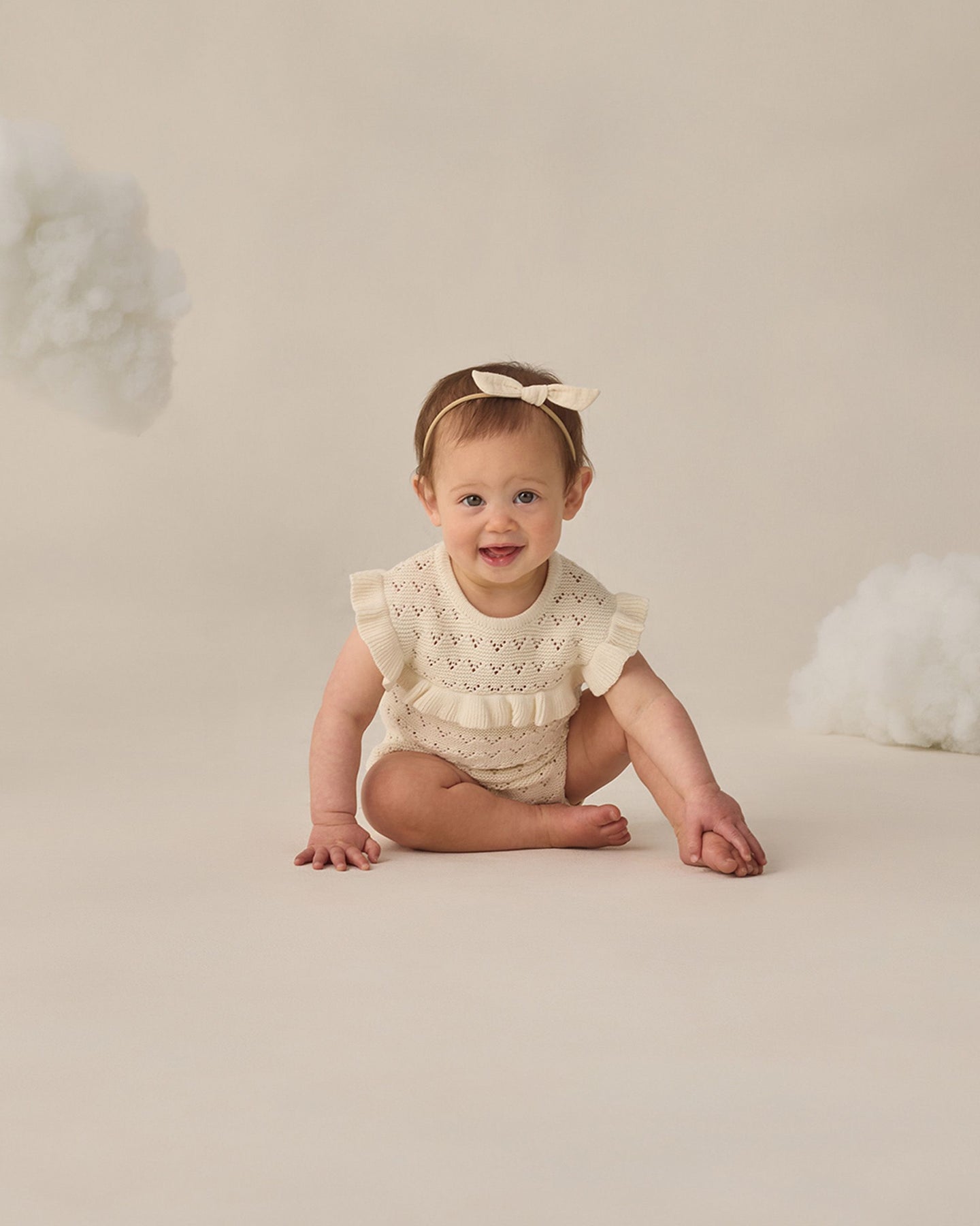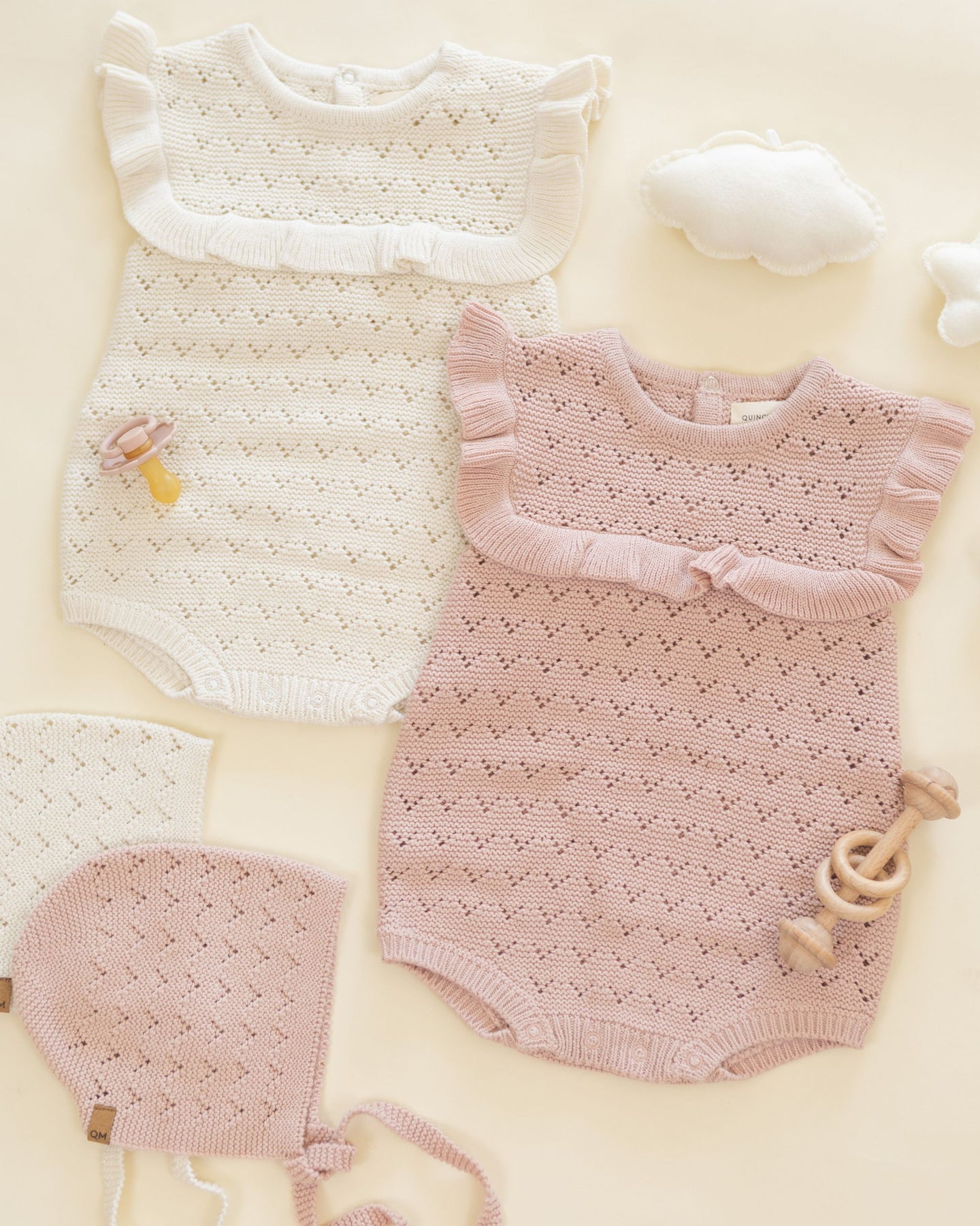 This pointelle romper has all the knit details and vintage feels. With an adorable ruffle trim, this romper looks cute for any special occasion.