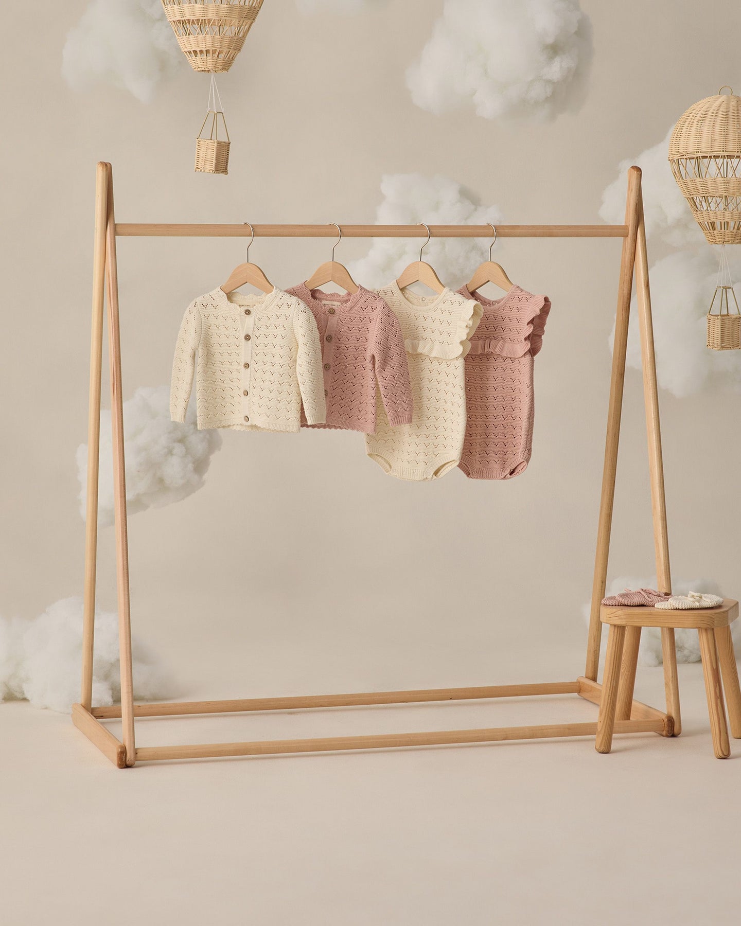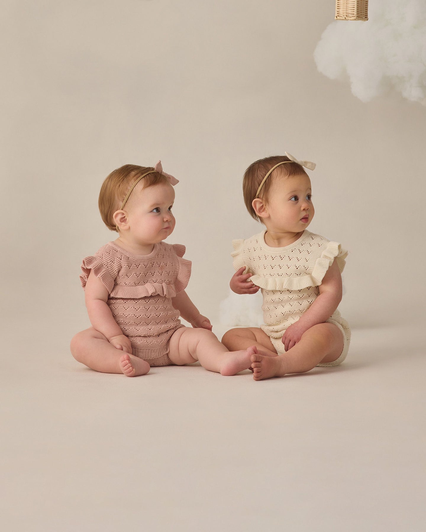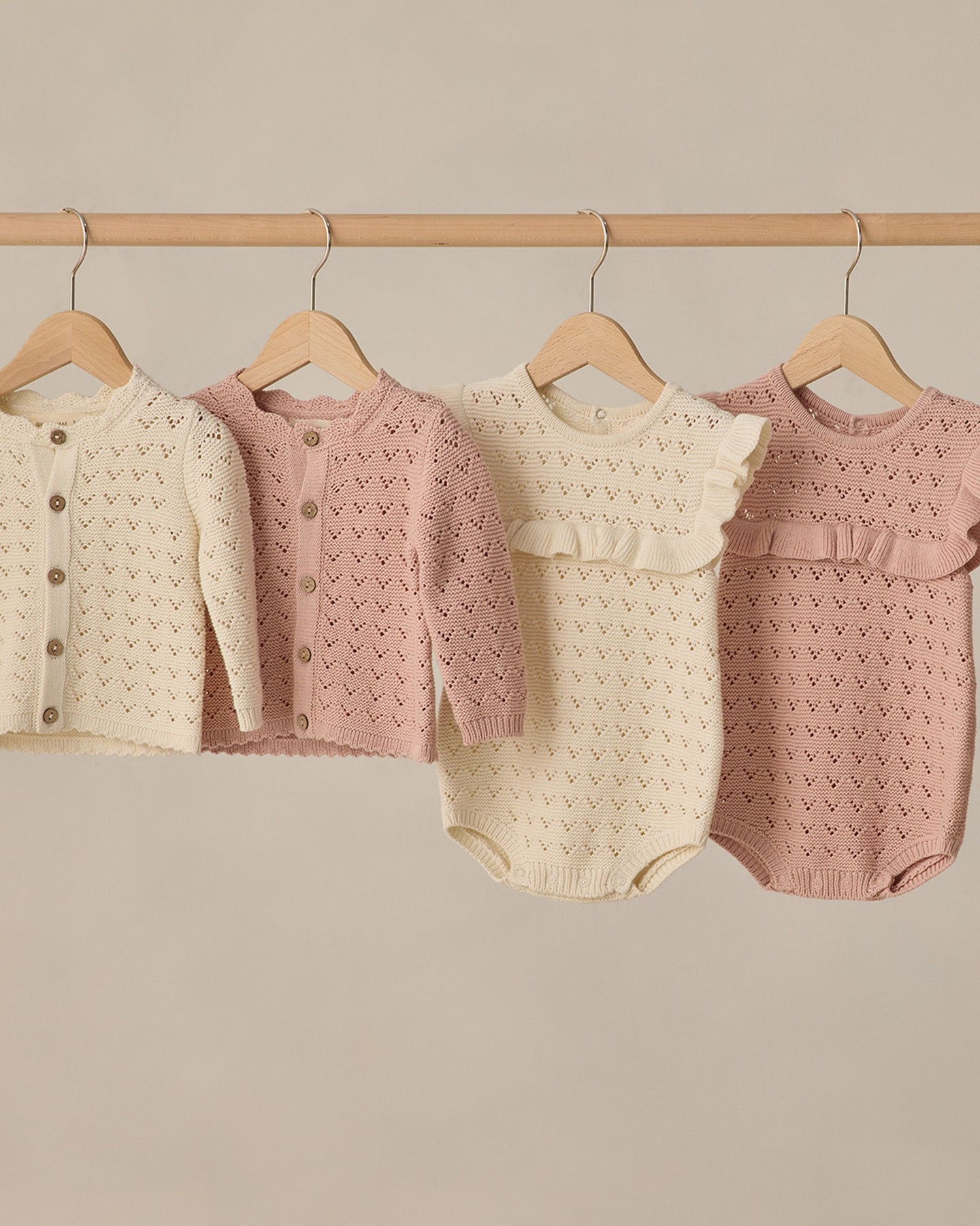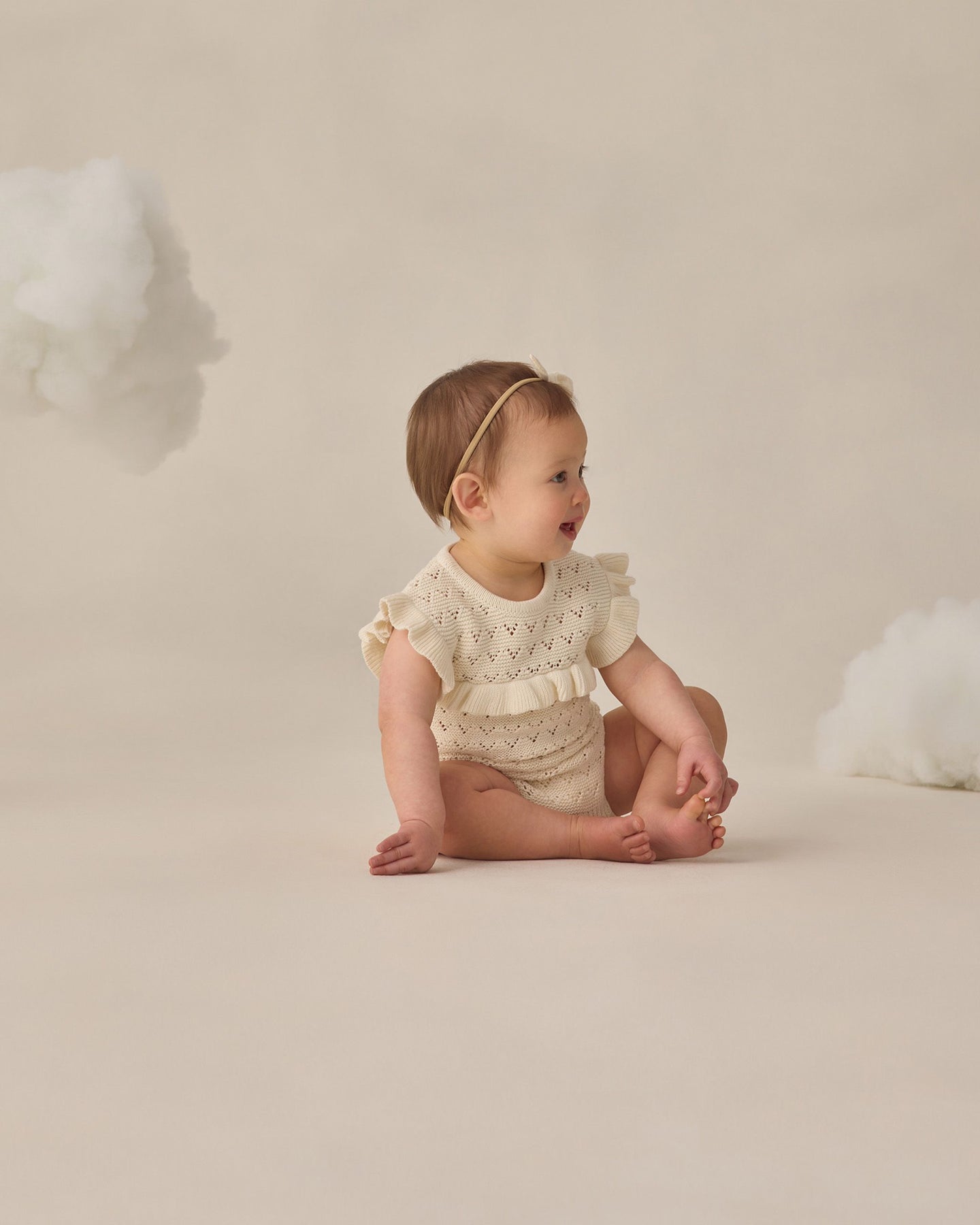 This pointelle romper has all the knit details and vintage feels. With an adorable ruffle trim, this romper looks cute for any special occasion.