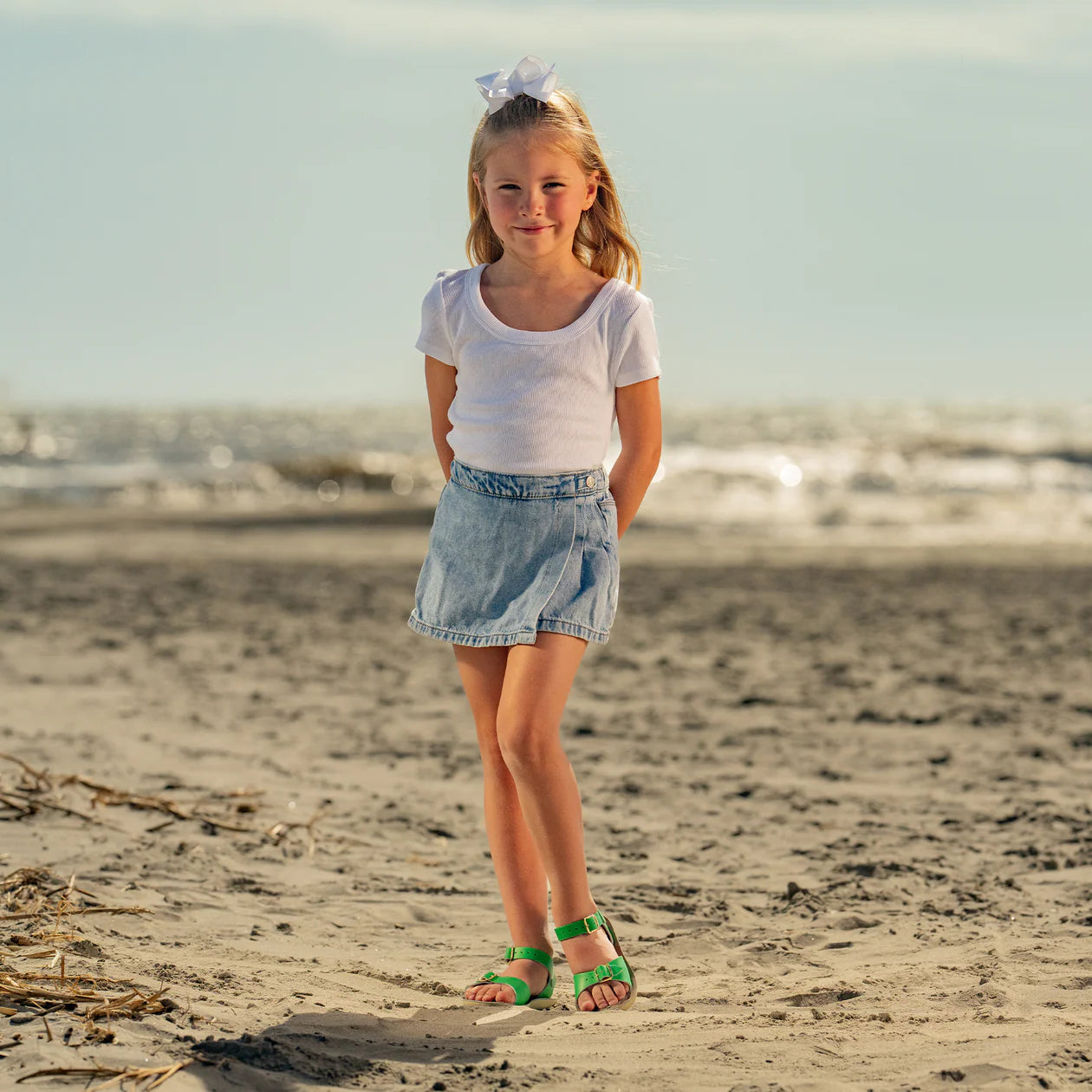 The Surfer is your classic two strap Jesus sandal. The adjustable toe buckle and ankle strap makes it the best all-rounder for both wide and narrow feet. The entire Sun-San range comes on a super comfortable spongy urethane sole with rust proof buckles. They can be worn in water and put through a cool machine wash. The Surfer comes in several lovely colours, and a range of finishes including shiny patent and metallic. The Surfer in navy is a classic kids summer sandal.